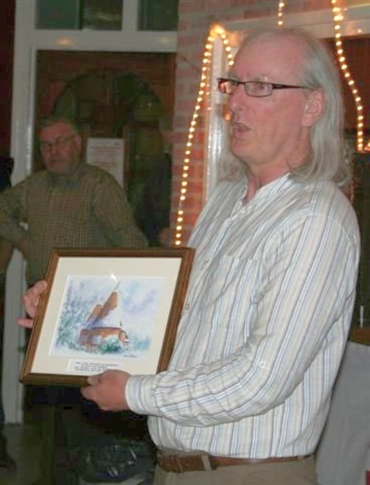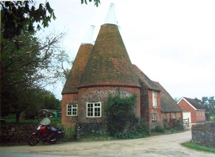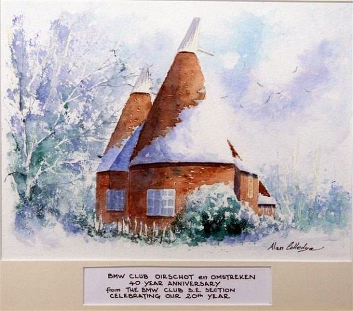 This beautiful painting was a gift from the South East Section of the BMW Club as present for our 40th anniversary. It is an Oast house, a building which was formerly used as a drying place for Oast (hops), as part of the brewing process. It is typical for the region.